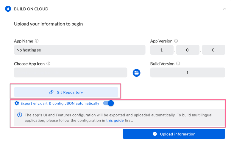 To begin building with your Git repository, follow the platform-specific guides above (Android, iOS, or PWA). Then, at Step 4 – Build on Cloud, before selecting Upload Information or Submit Build, make sure to complete the following steps: