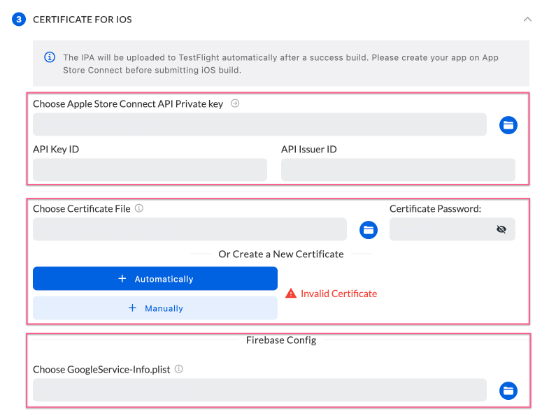 - Input information of Apple Store Connect, Certificate, Google service files as below: