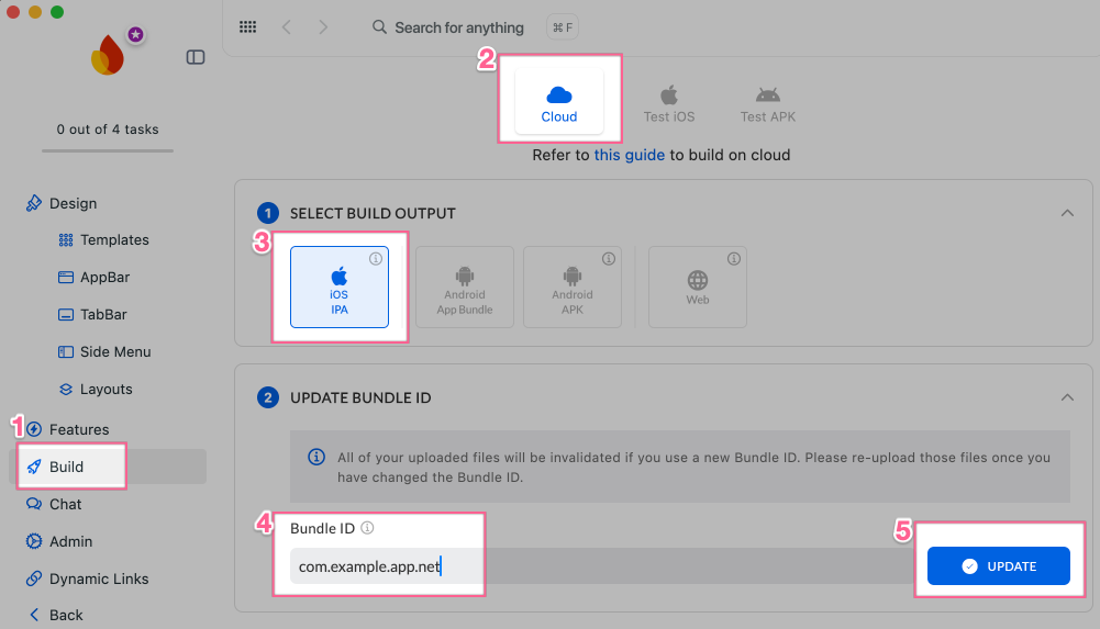Bundle IDand clickUPDATEbutton. (the way to create Bundle ID of iOS app in this guide). Your Bundle ID must not include reserved keywords.