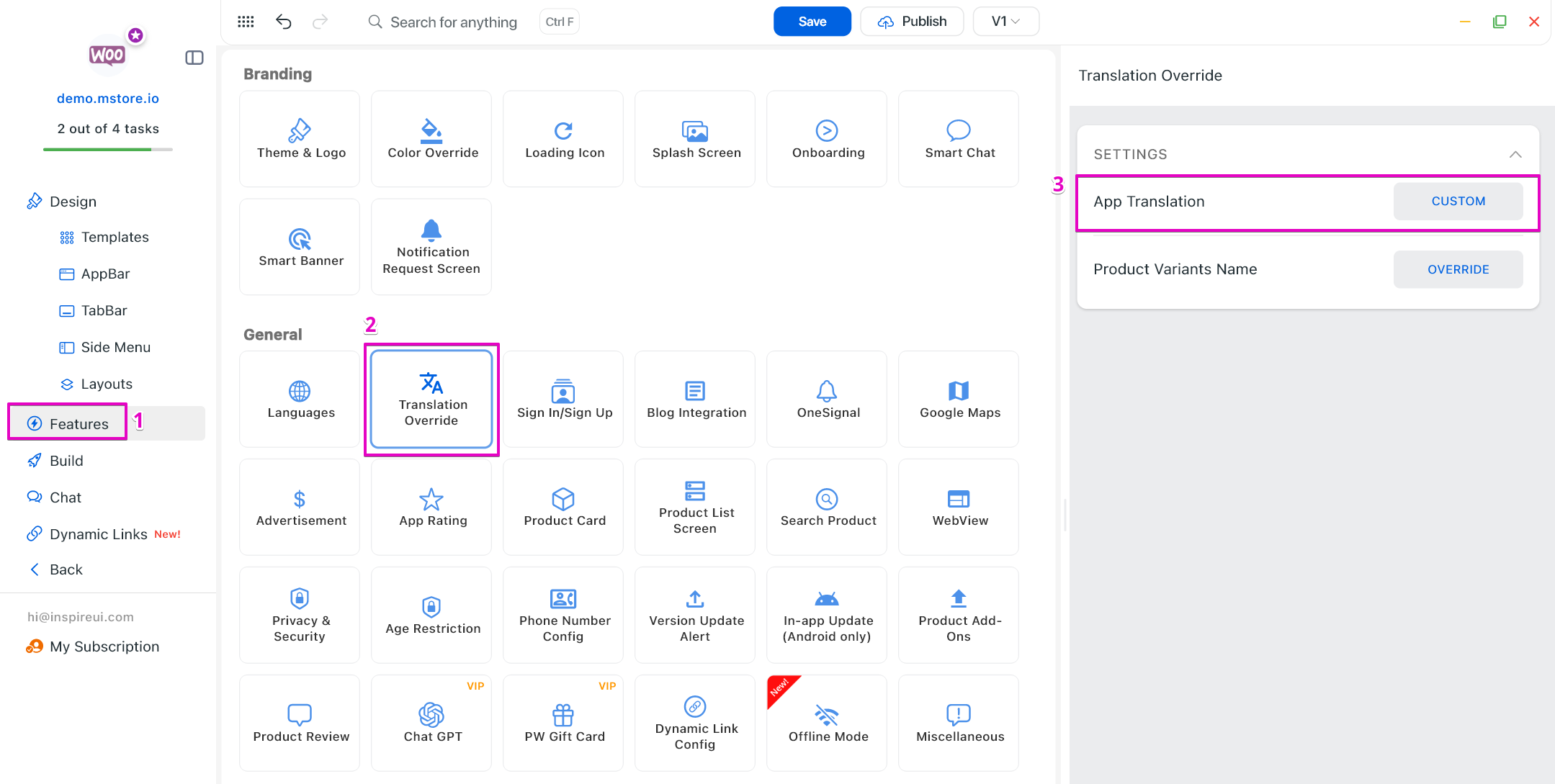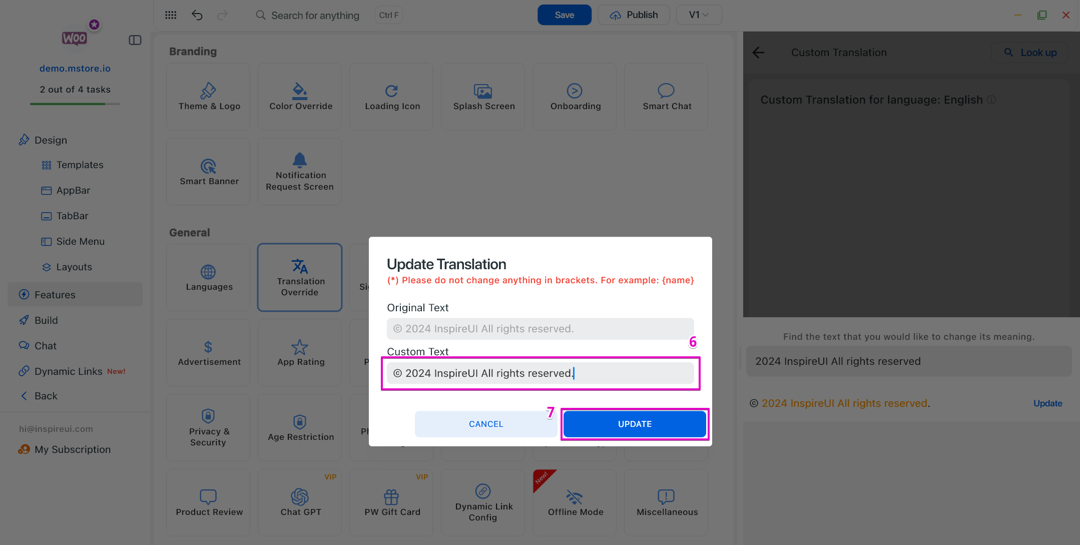 Click the CUSTOM button of the App Translation.