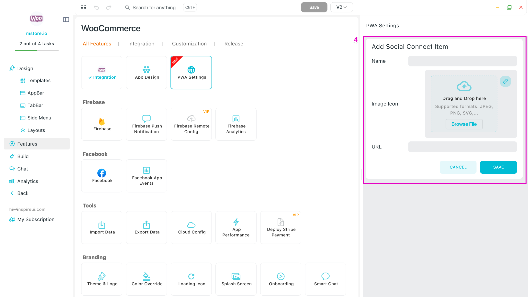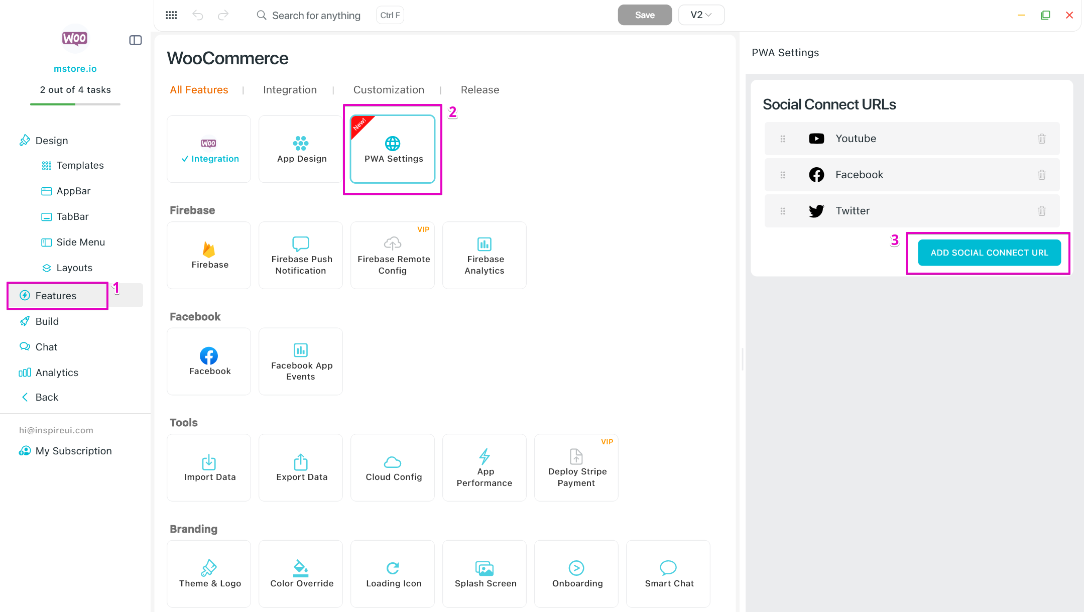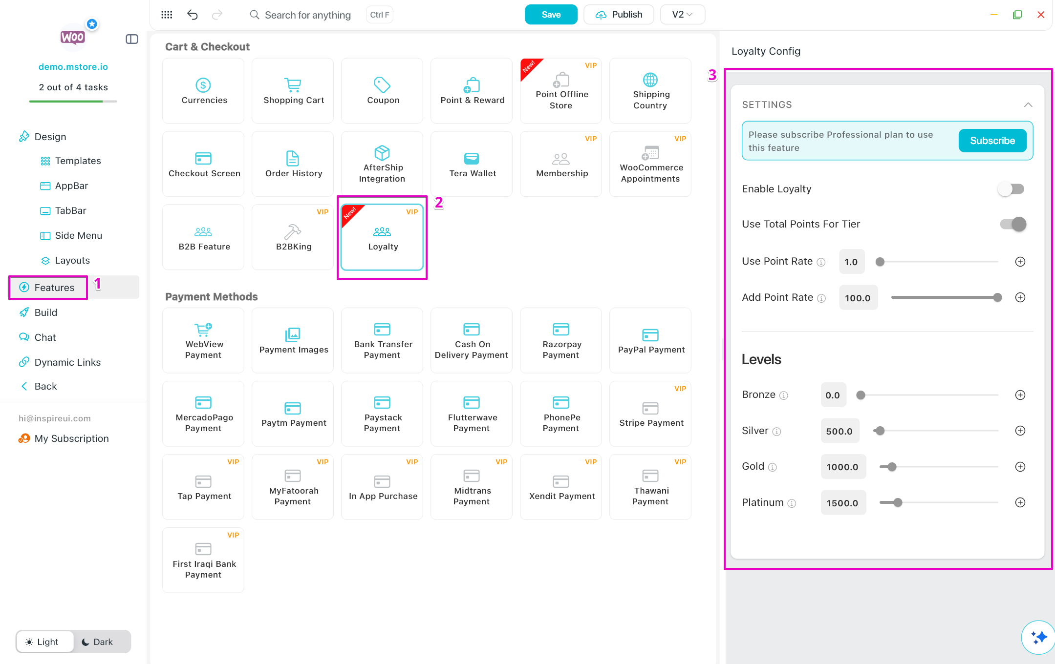 - Ask the AI to configure Features, adjust Design, or guide you step by step in creating your app.