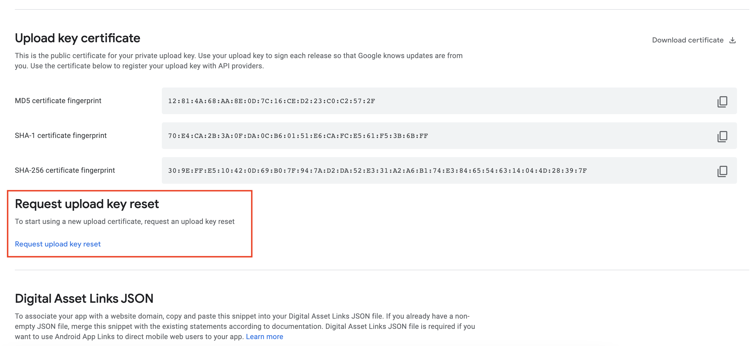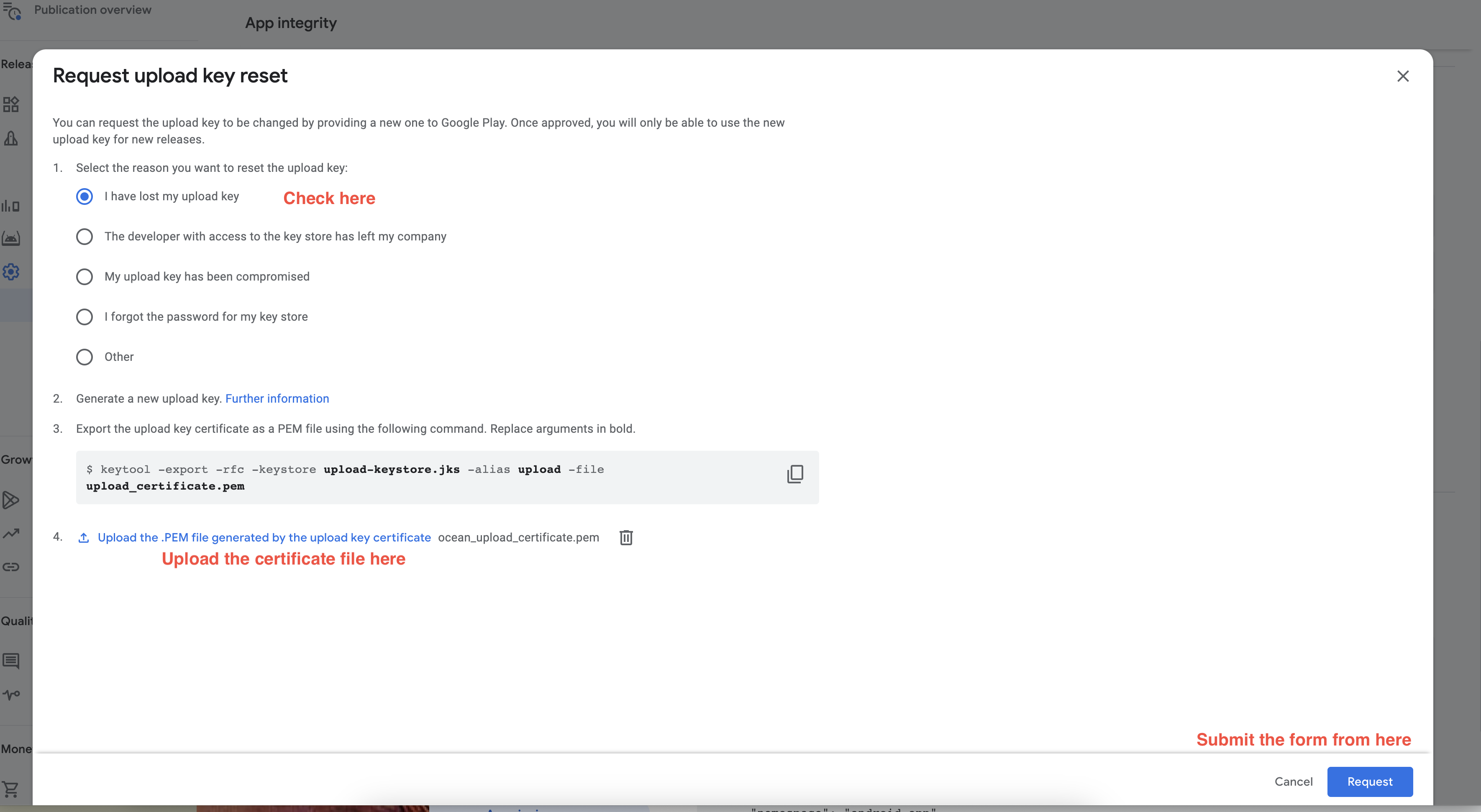 - Then submit a request to reset the uploaded key on Google Play console and wait for Google to accept (1~3 business days):