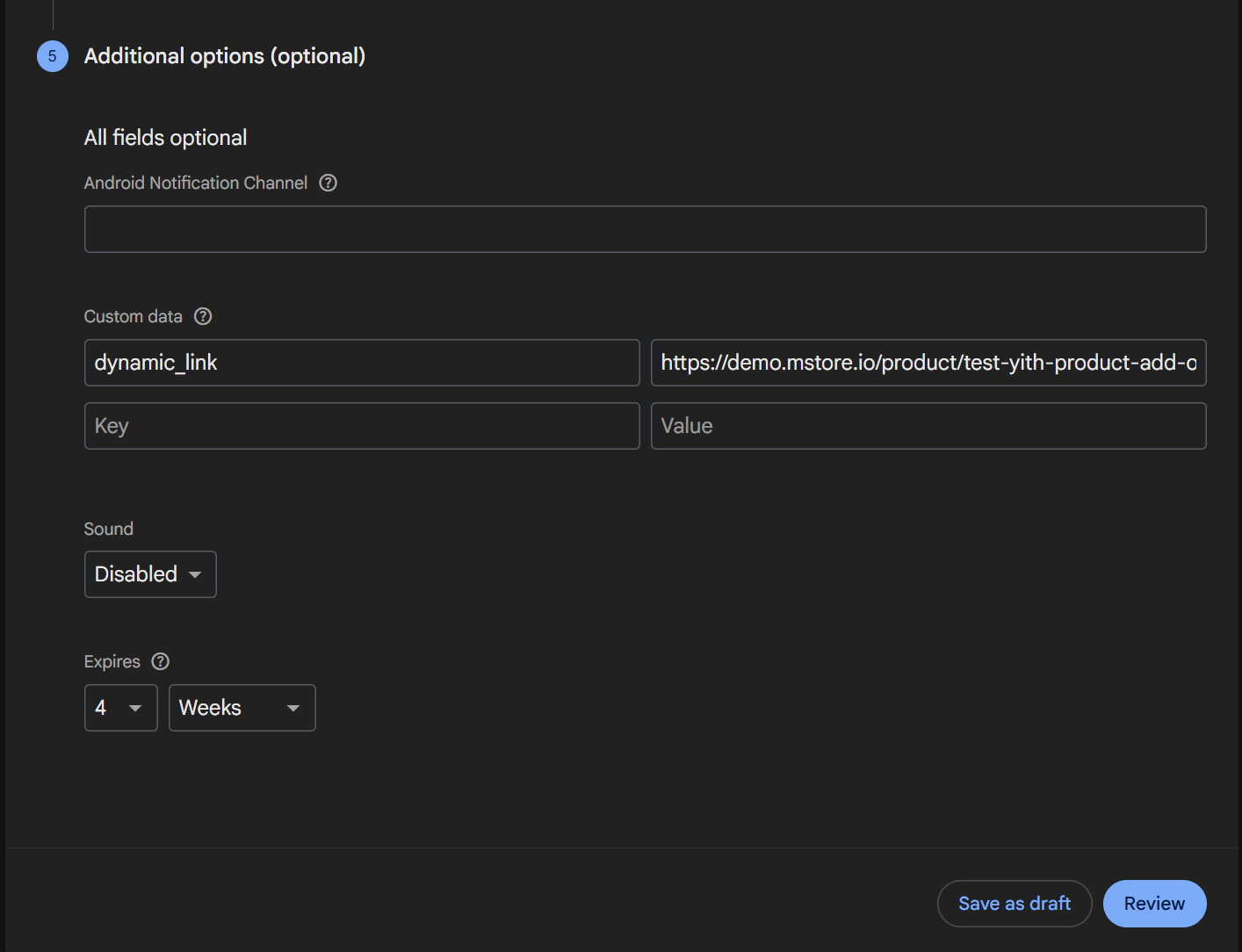 In step 4 - Additional options (optional) - you will add a Key-Value for the Custom Data, fill dynamic_link for Key and the Product URL for Value.