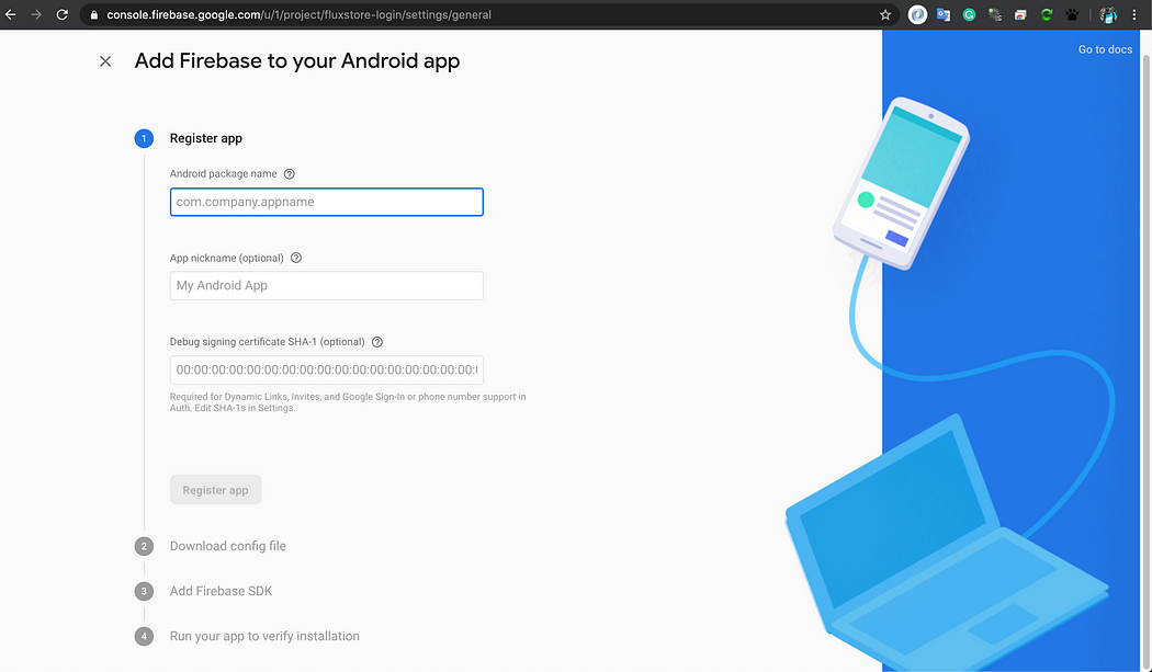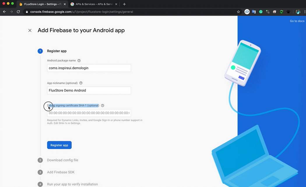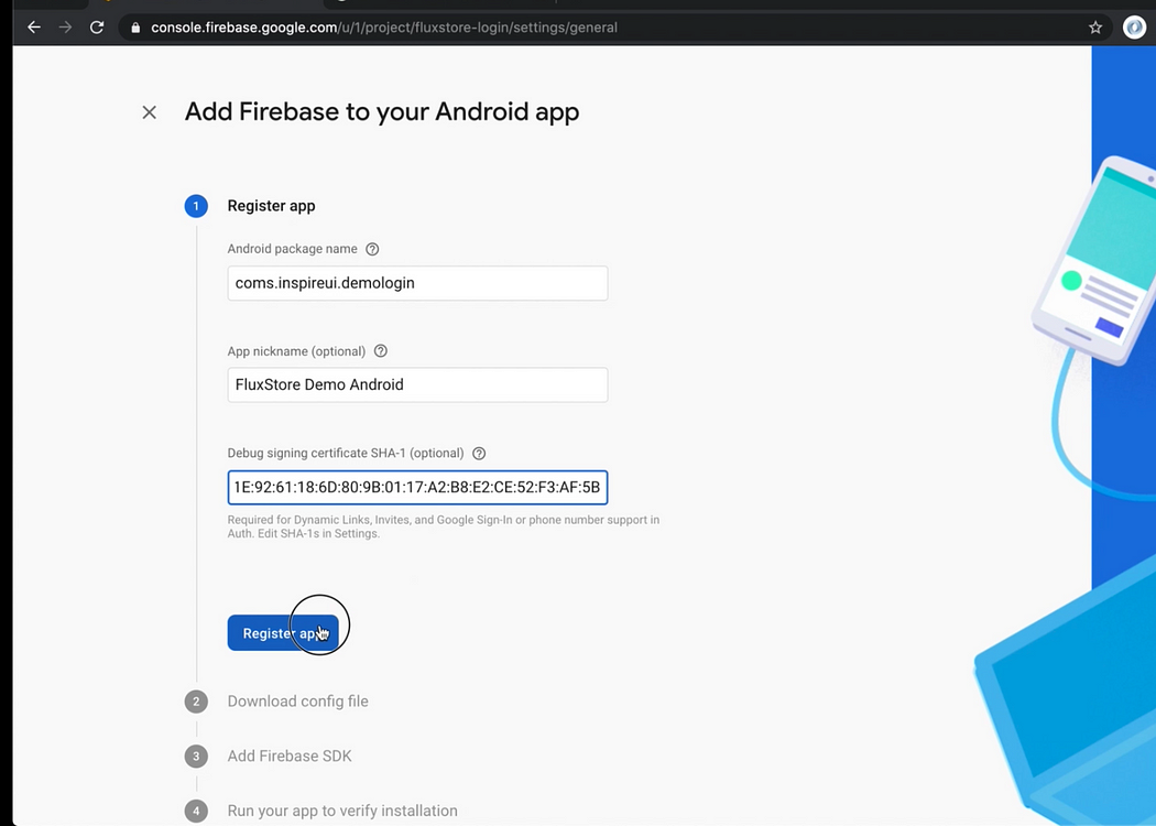 For Android, open the project on the **Firebase console**. Then move to **Settings/General**. You need to upload **SHA key** to firebase project. You can follow this guide to _**generate SHA key**_ [https://developers.google.com/android/guides/client-auth](https://developers.google.com/android/guides/client-auth)