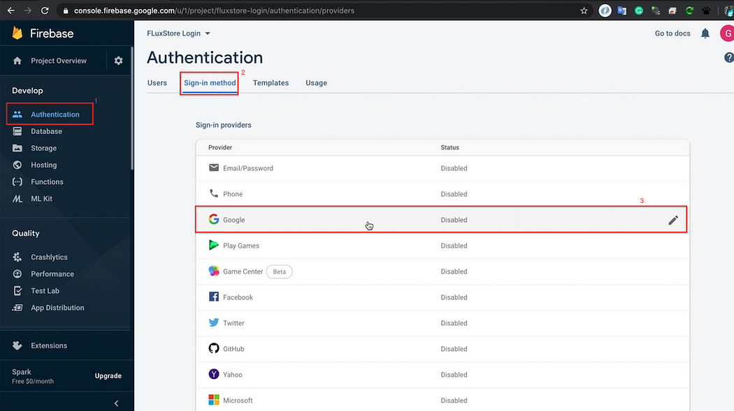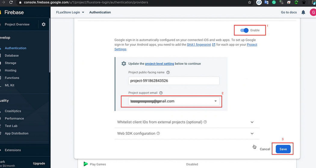 • Open your firebase project, in the left menu bar, select AuthenticationSign-in methodGoogle