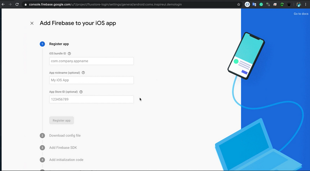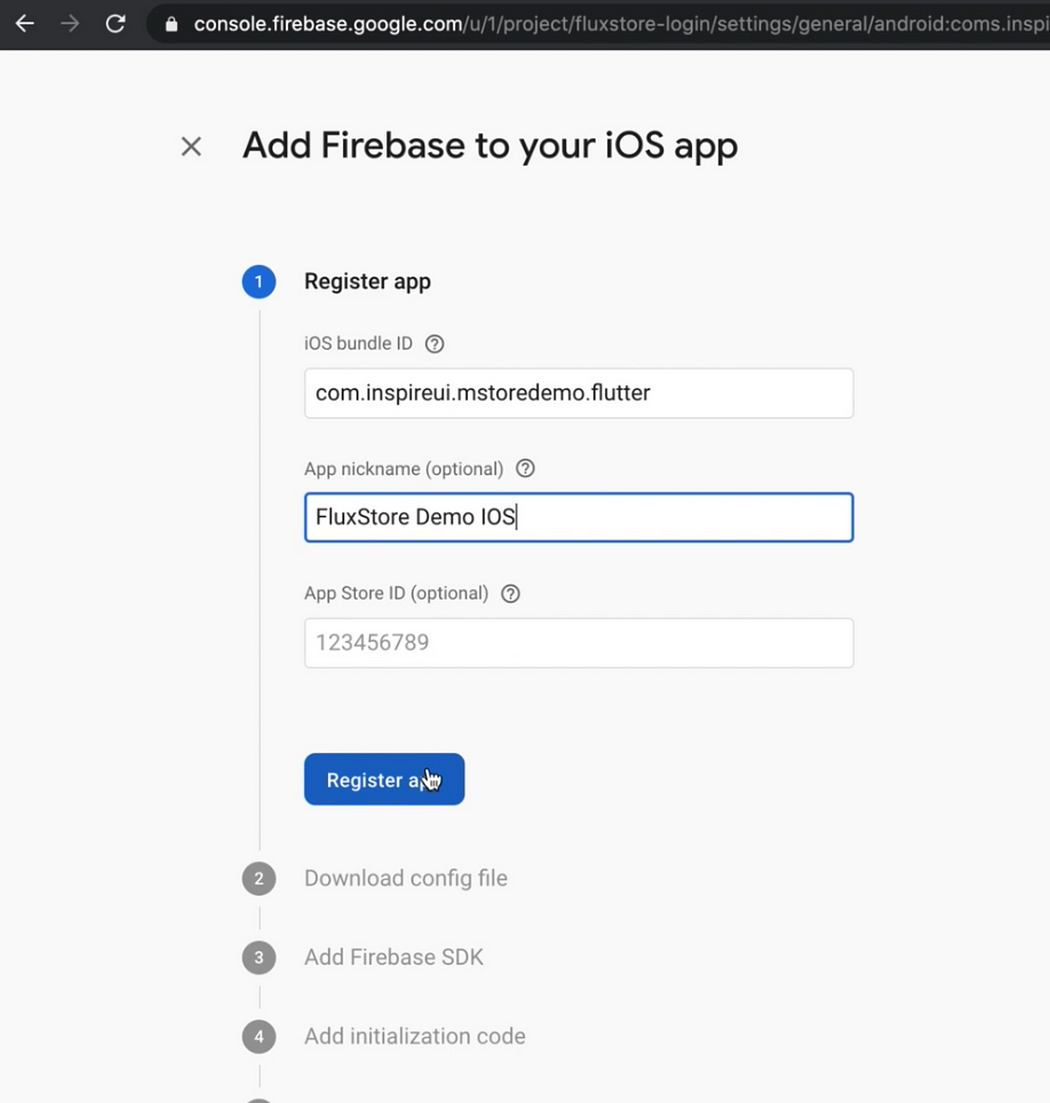 • Enter Bundle ID and App nickname (optional). Then click Register app to continue