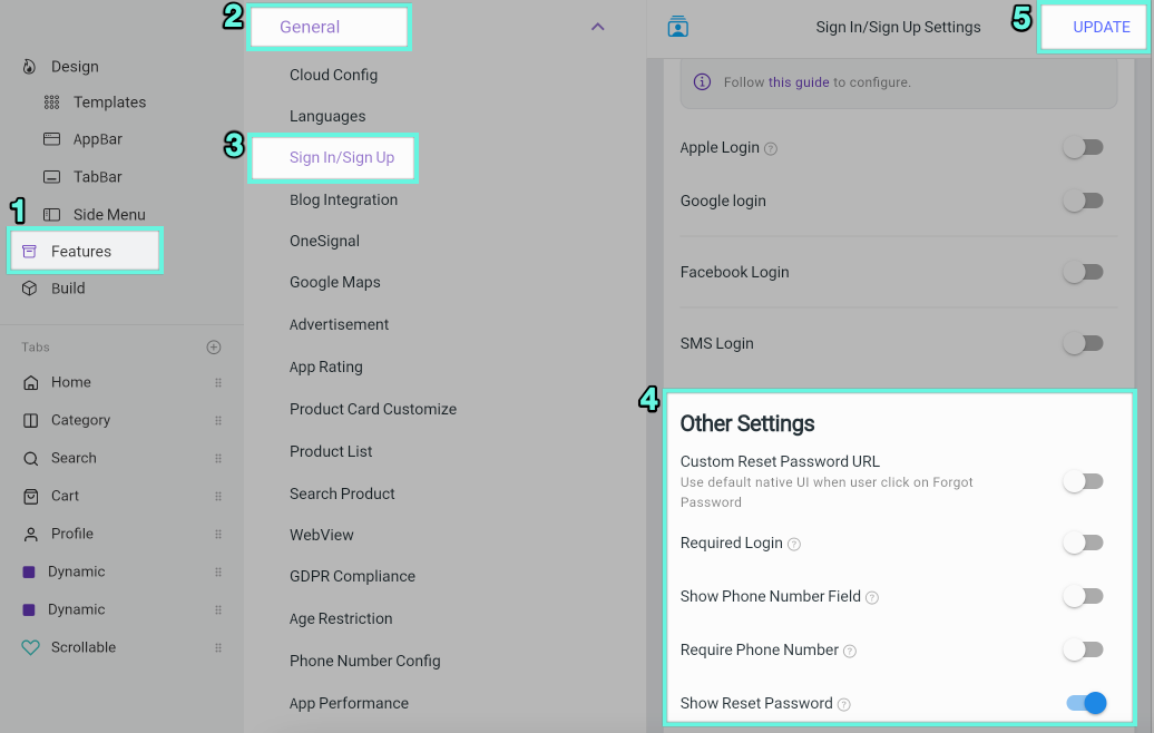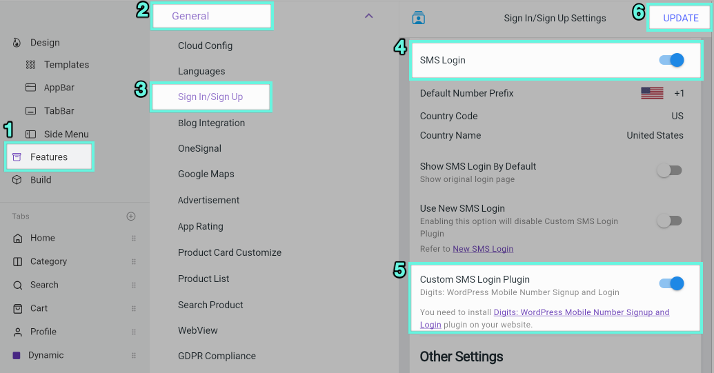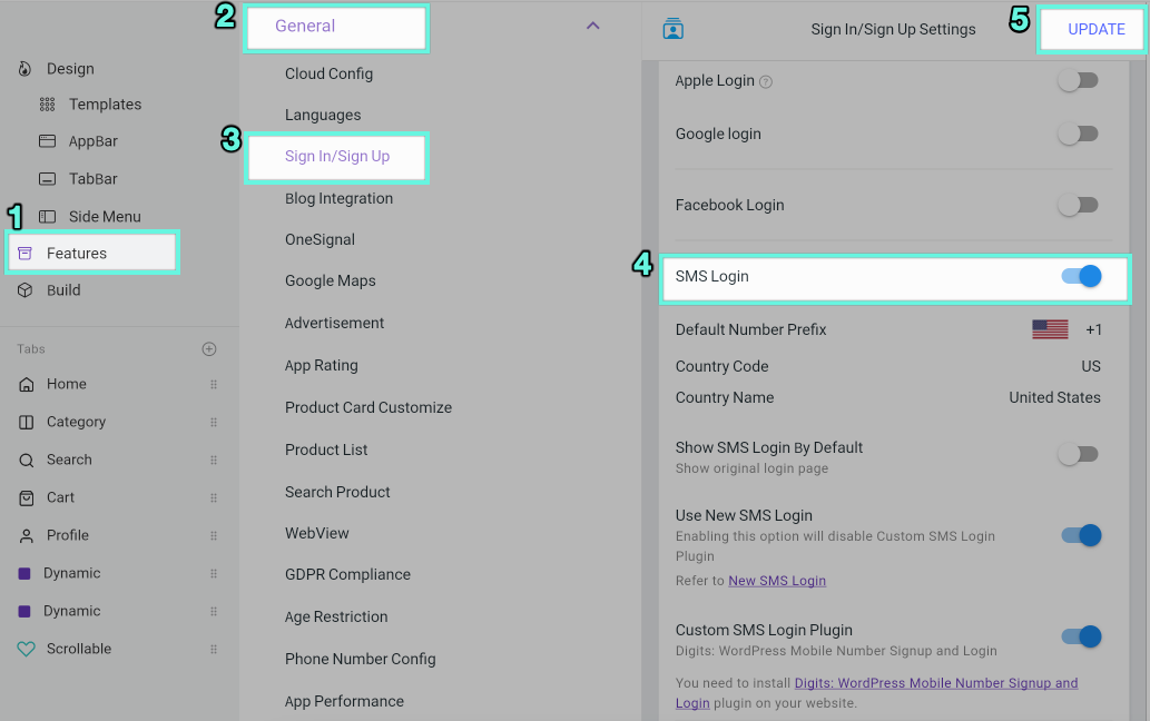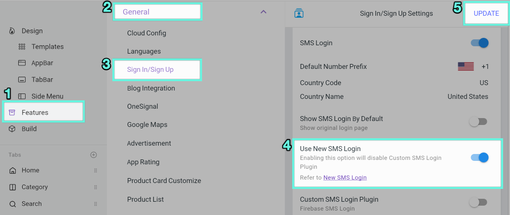 • Enable this new feature by go to Features > General > Sign In/Sign Up > enable SMS Login > enable Use New SMS Login