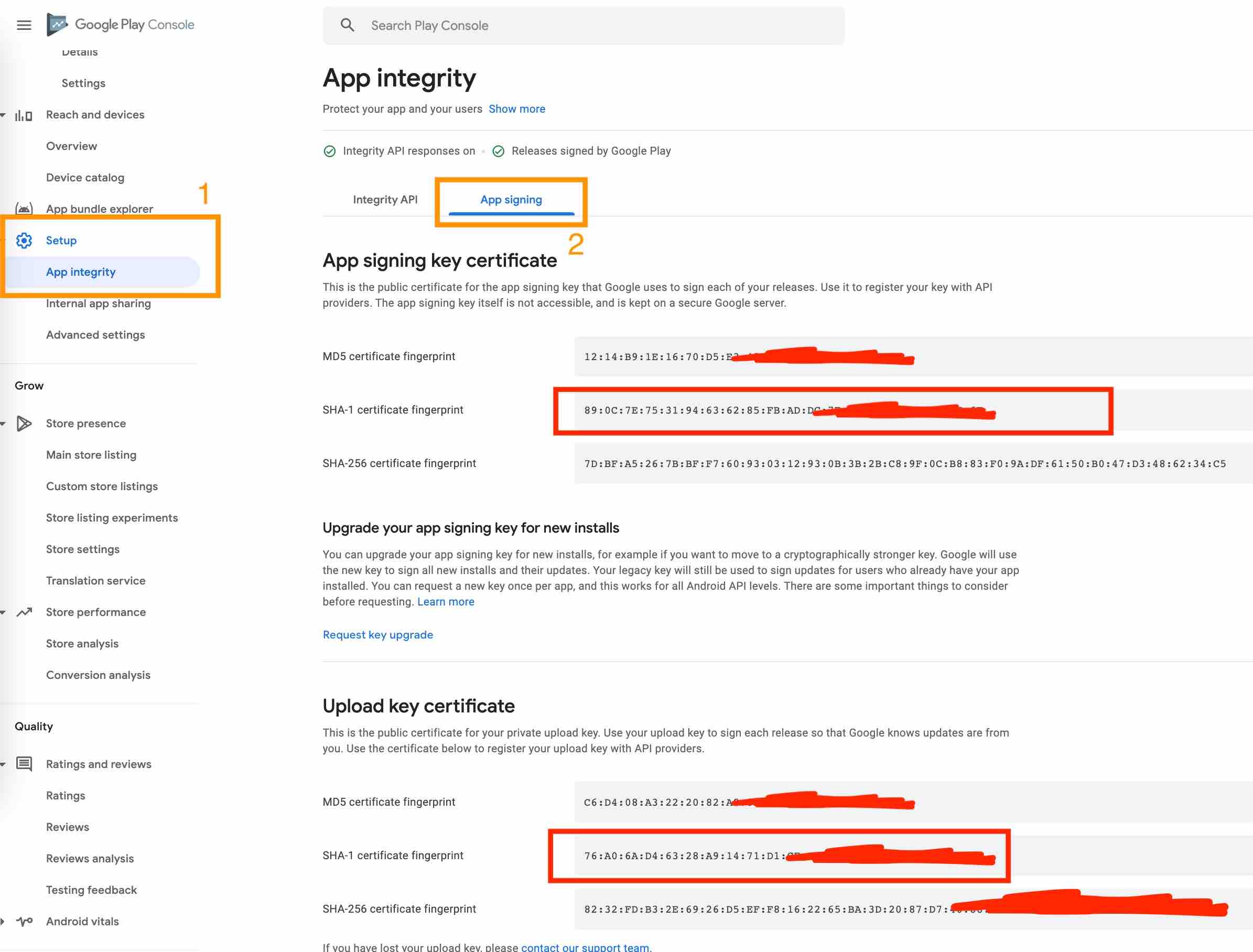 • Get from Play Store: Once uploaded the app to Google Play Console, you get SHA-1 and SHA-256 keys under App signing key certificate & Upload key certificate