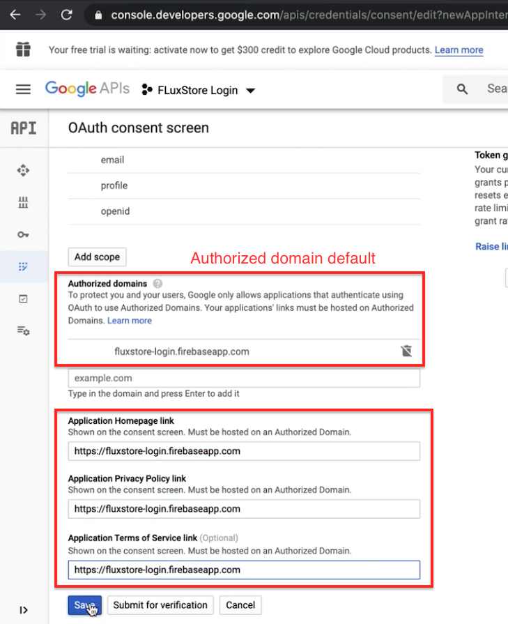 • Enter Application Homepage link, Privacy policy link, Terms of Service link. If not, use it with the default Authorized domains link (don't forget to add https://).