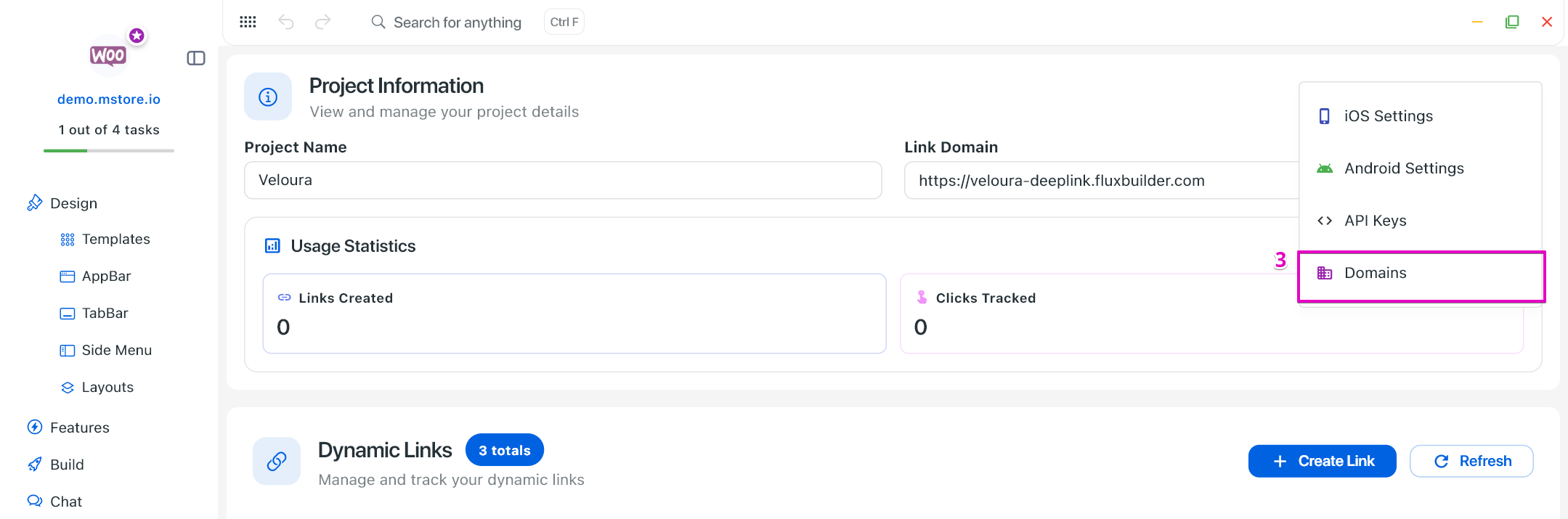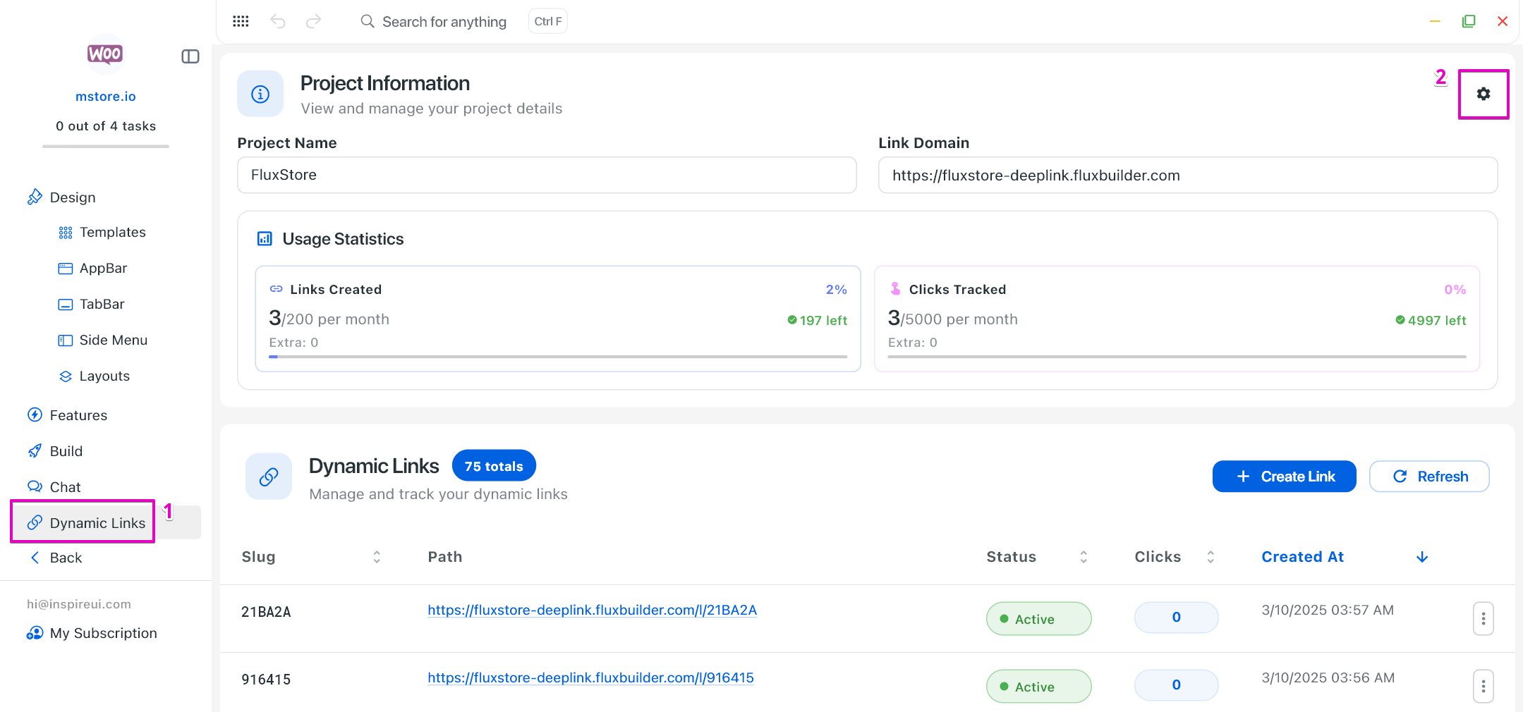 After creating project successfully, you will be navigated to the FluxBuilder Dynamic Links dashboard. Here, you can: