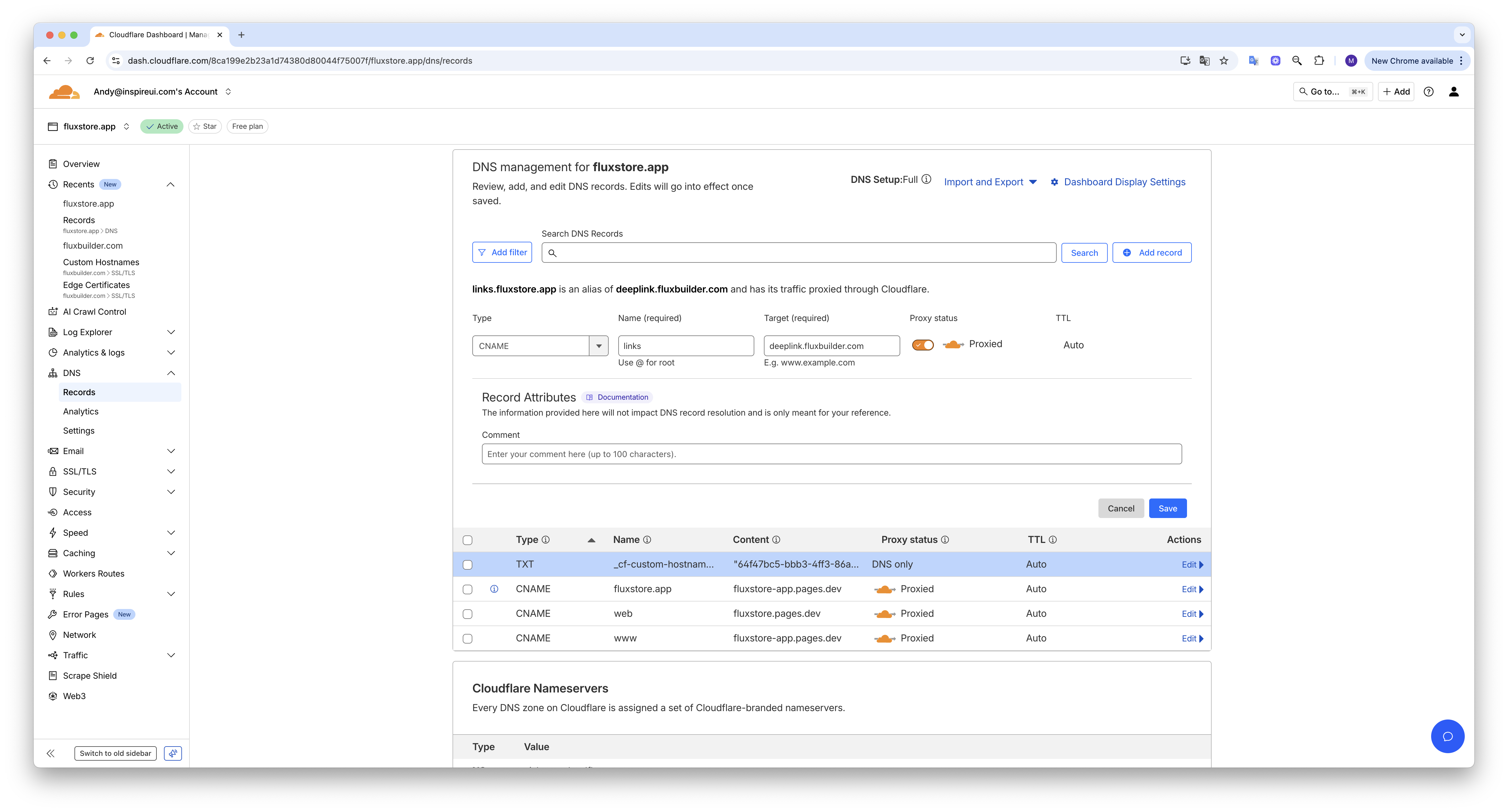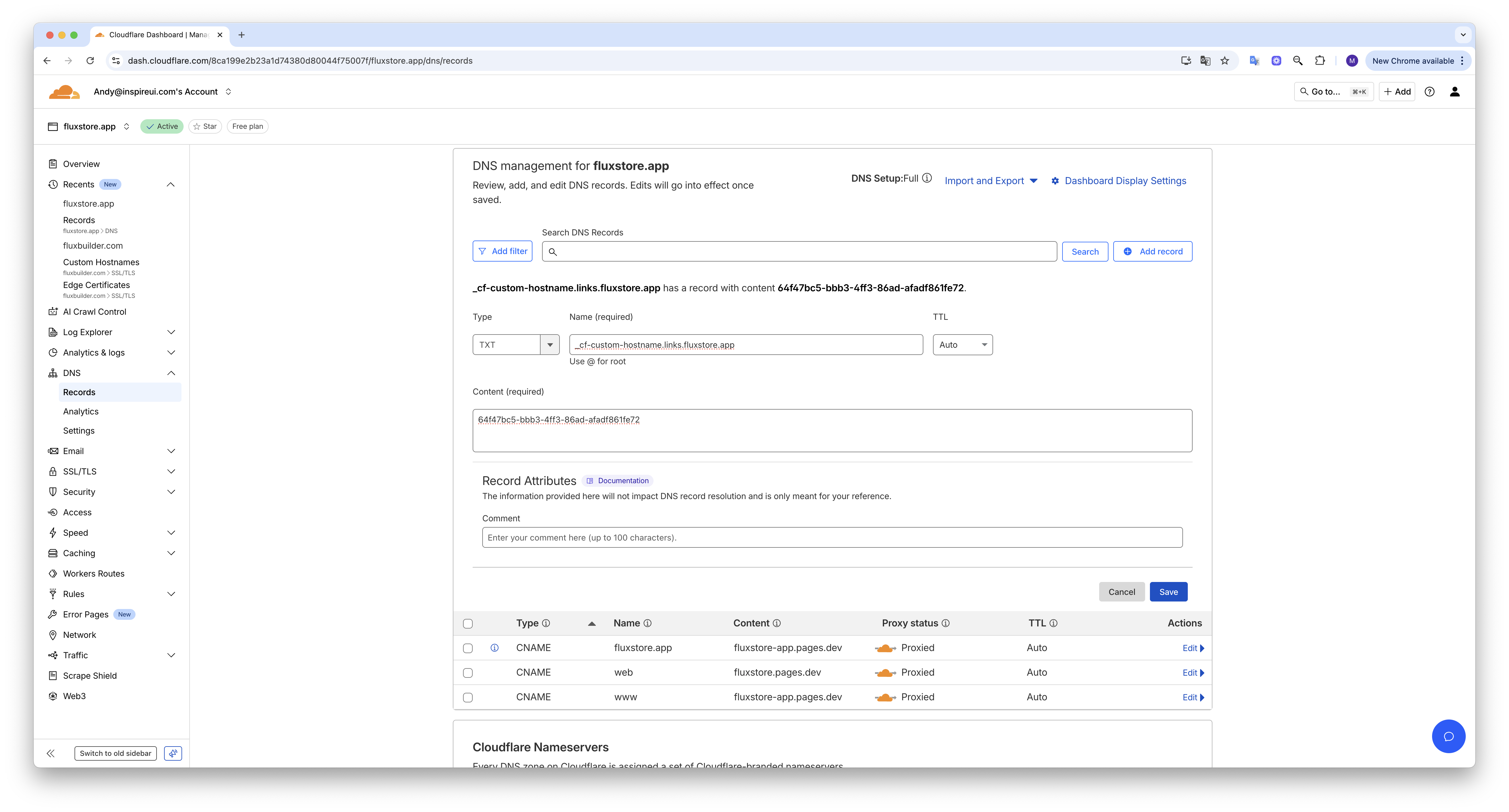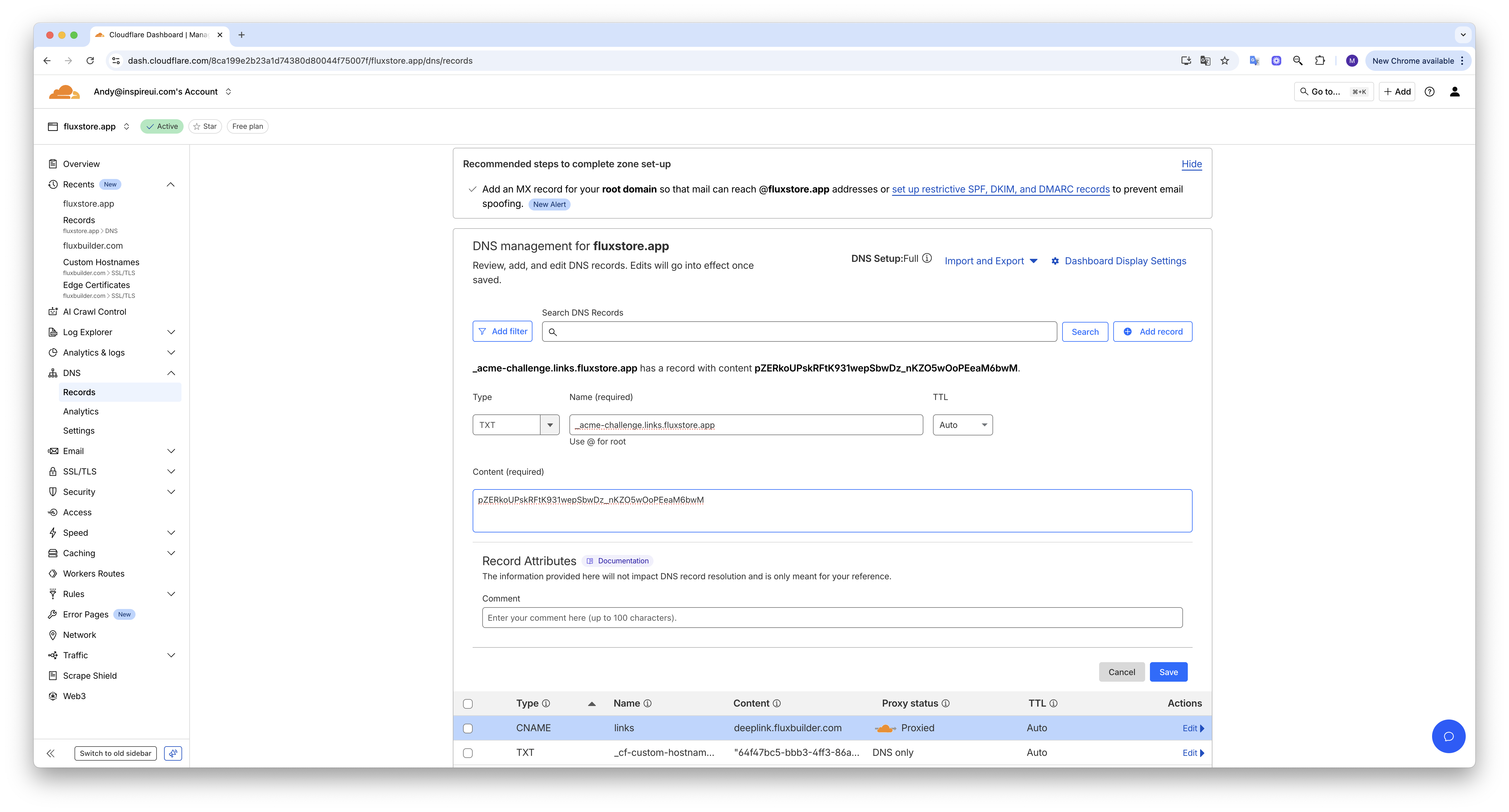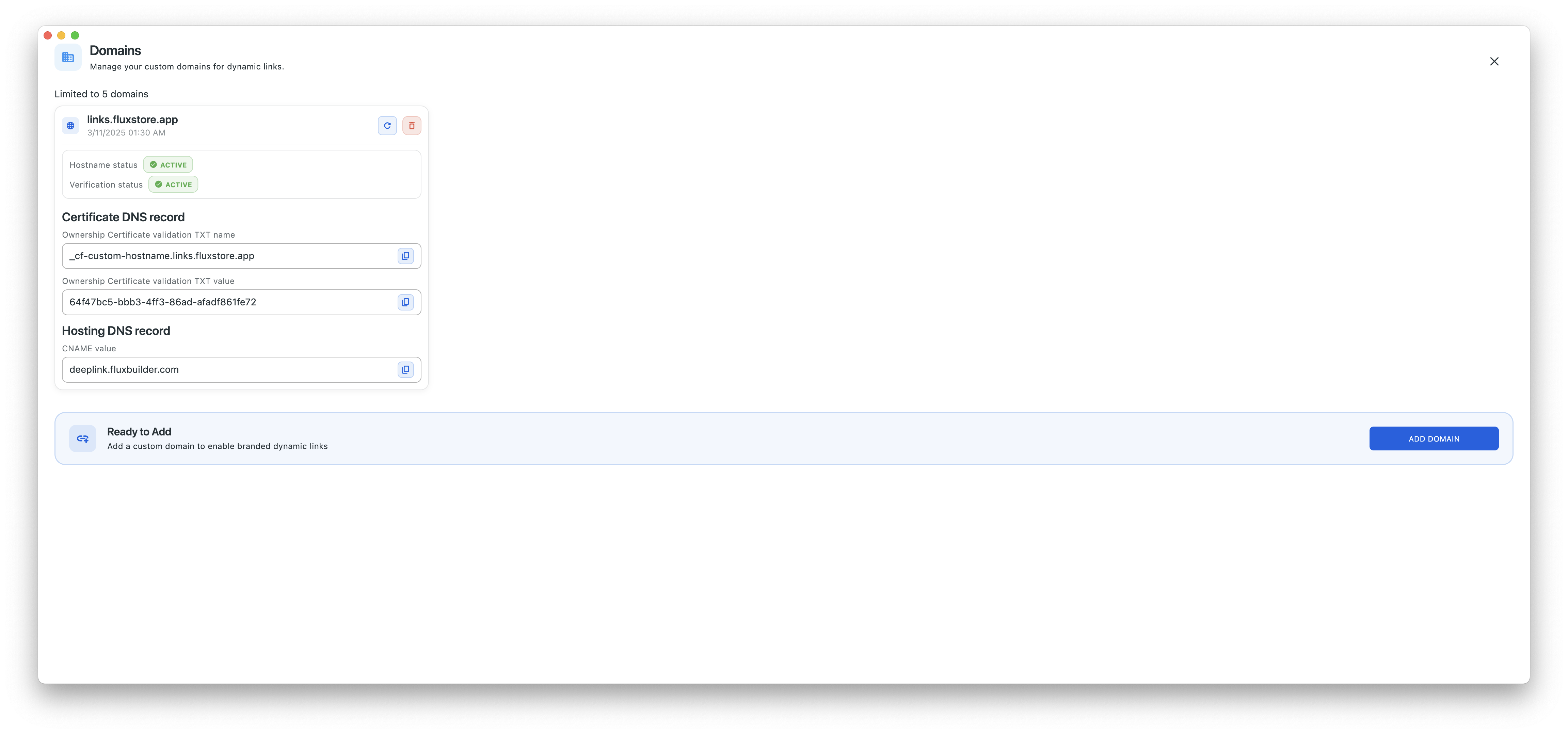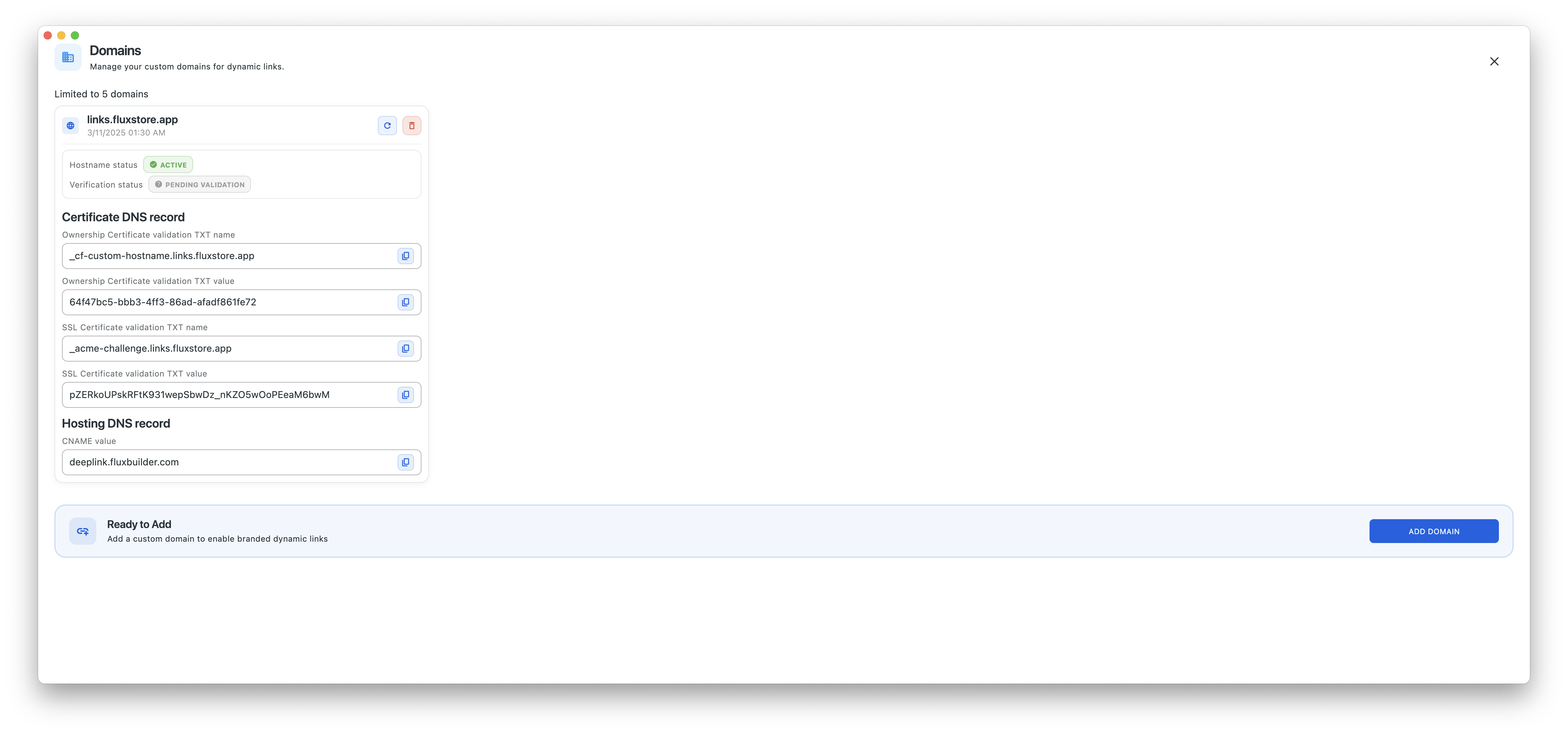 After adding the records, back to FluxBuilder and reopen Domain page. If the records do not appear immediately, please wait 2–3 minutes and try again.
