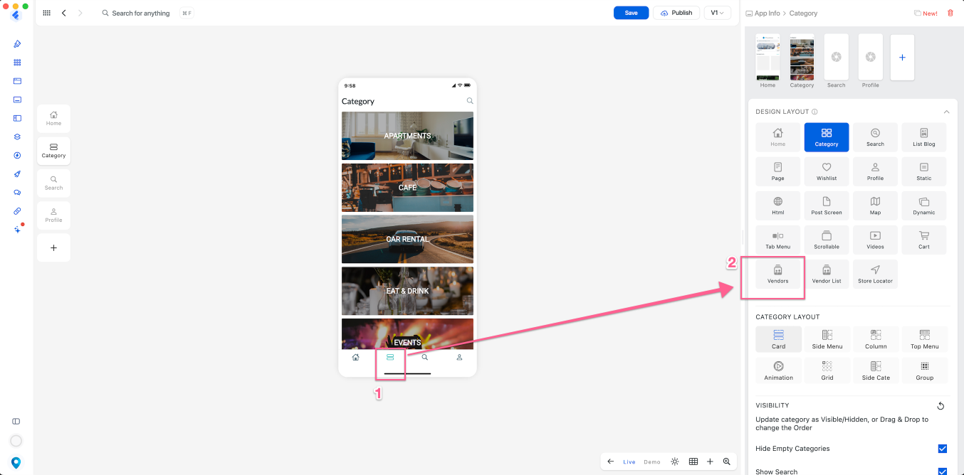 - To show the Vendors list in the Category tab, open your Listeo app on FluxBuilder. Then click the Category tab (1), and select the Vendors item (2):