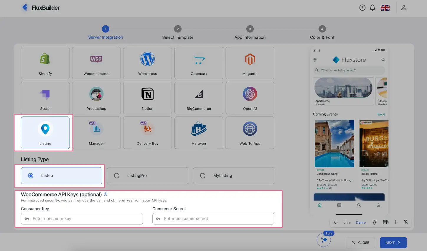 - Create a Listeo app on the FluxBuilder drag-and-drop app builder, following this video guide. NOTE: Remember to input yourWooCommerce API Keys: (Make sure your API keys have Read/Write permissions.)