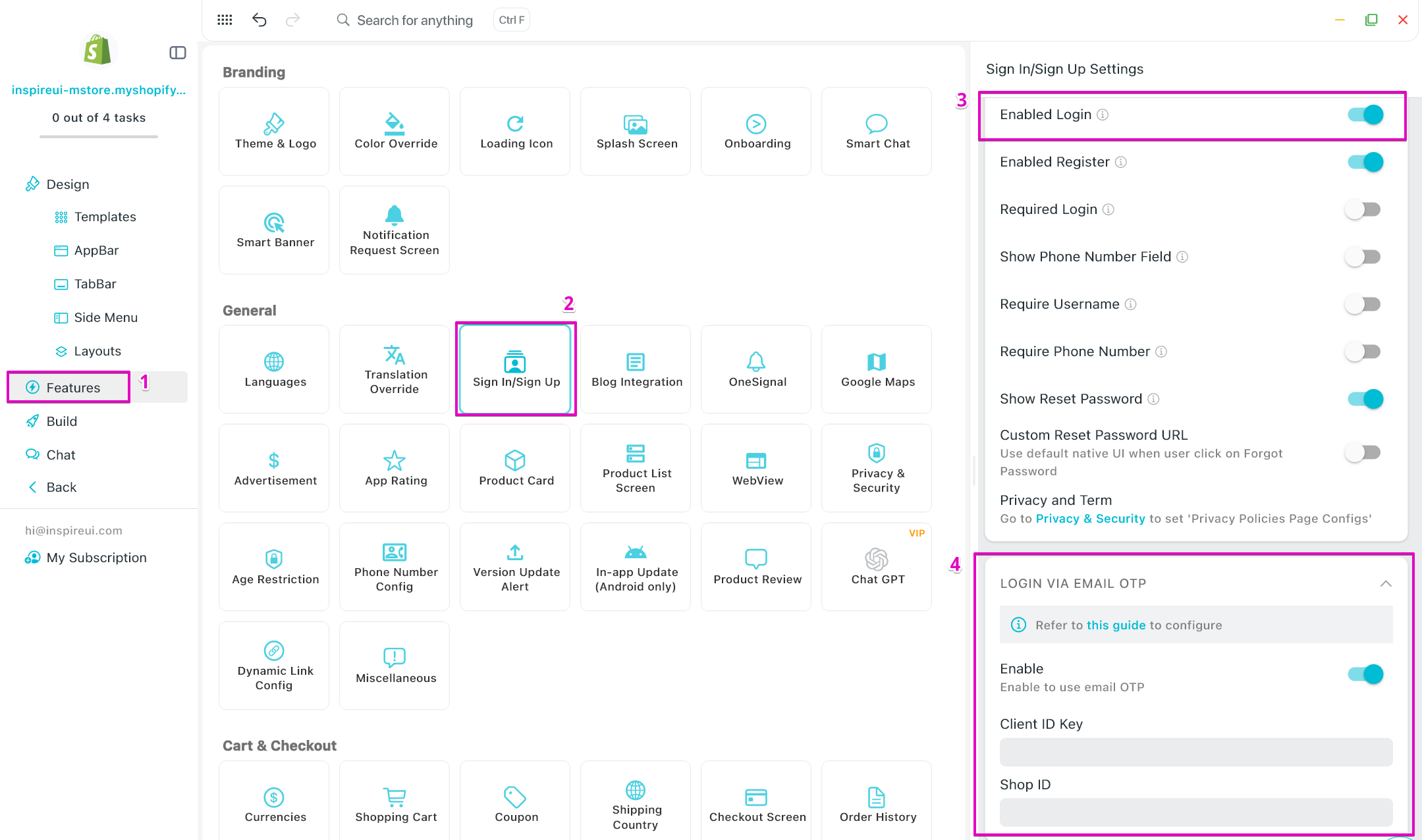- After collecting both values, open your Shopify app on FluxBuilder. Go to Features and open Sign In/ Sign Up. Here, remember to Enable Login. Then, scroll to LOGIN VIA EMAIL OTP, enable it and submit Client ID Key and Shop ID.