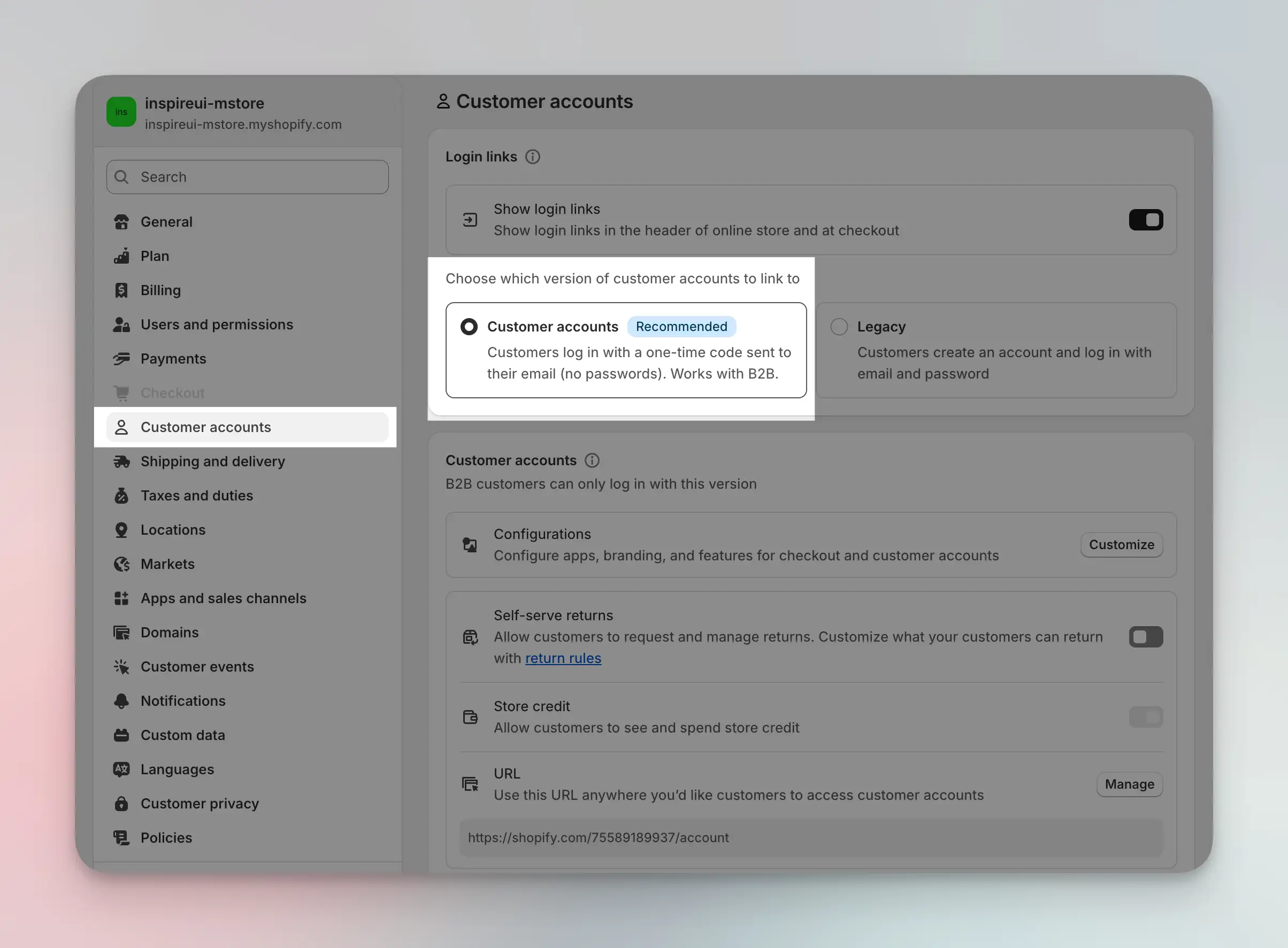 Go to your Shopify Admin Dashboard → Settings → Customer accounts