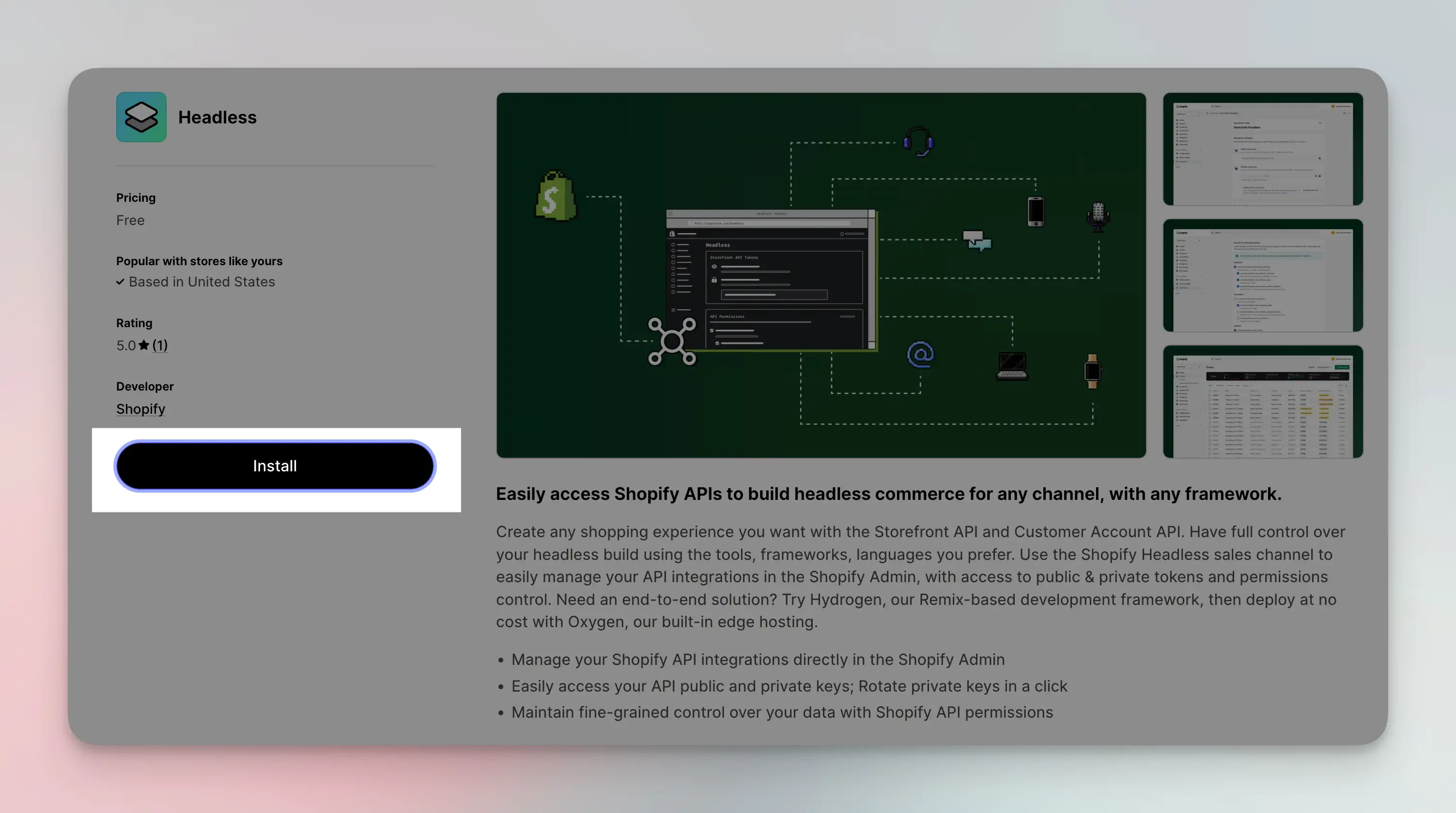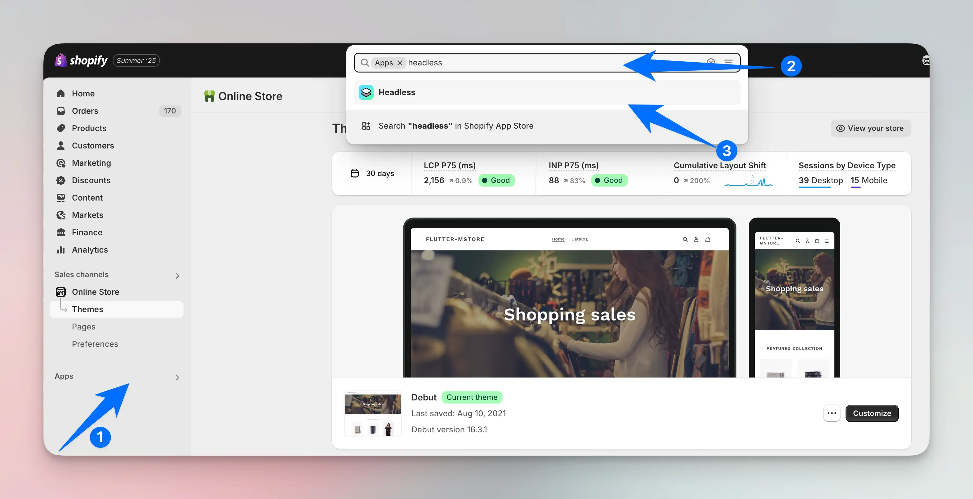 Go to the Shopify Dashboard → App → search for headless and select Headless