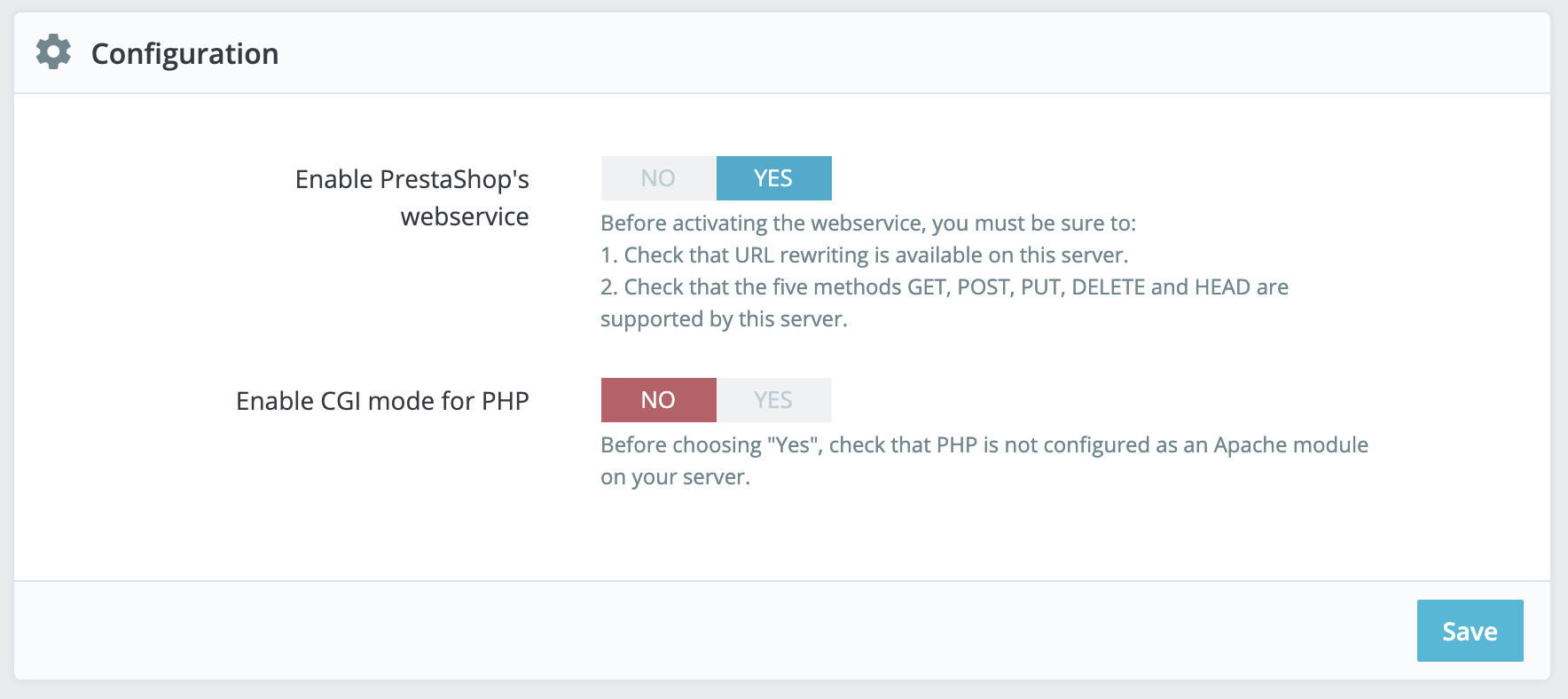 Enable Webservice By default, the webservice feature is disabled on PrestaShop and needs to be switched on before the first use. Go to Dashboard > Advanced > Webservice. Choose “Yes” for the “Enable PrestaShop Webservice” option and click the Save button