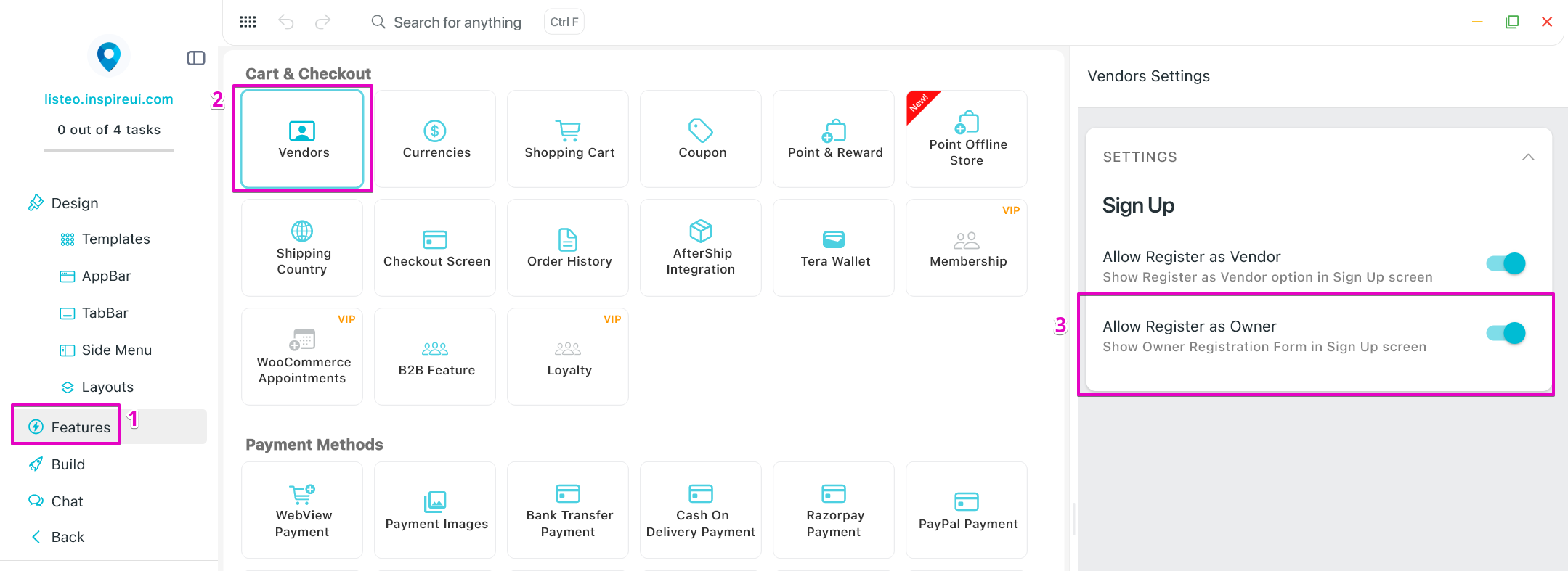 - Go to Features → in Cart & Checkout, select Vendors