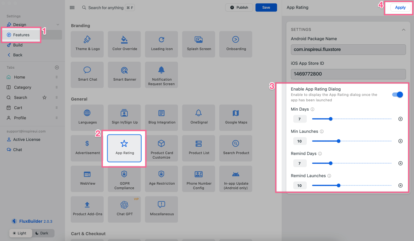 Directly set the Rating time for your app . This feature includes support for replaying a Rating dialog that attracts users to rate your app.